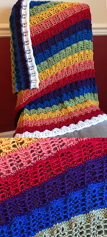 A rainbow baby is a baby born shortly after the loss of a previous baby due to miscarriage, stillbirth, or death in infancy. This term is given to these babies because a rainbow typically follows a storm, giving us hope of what's to come. The yarn is super soft with 7 colors: red, orange, yellow, green, blue, purple and white borders to represent clouds. 36" x 36".